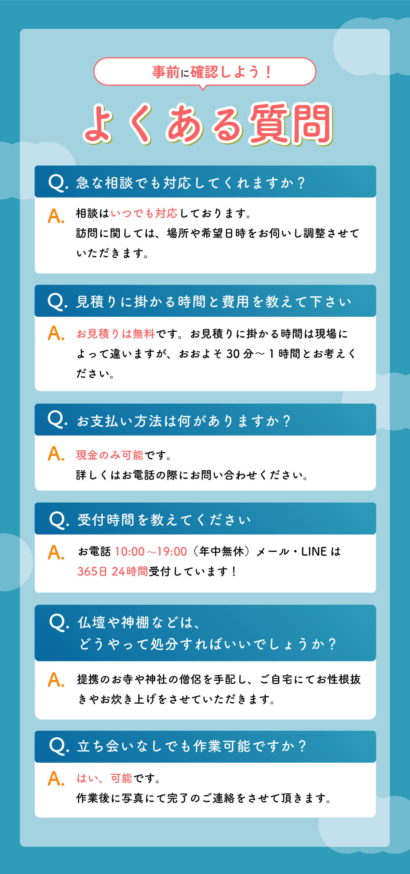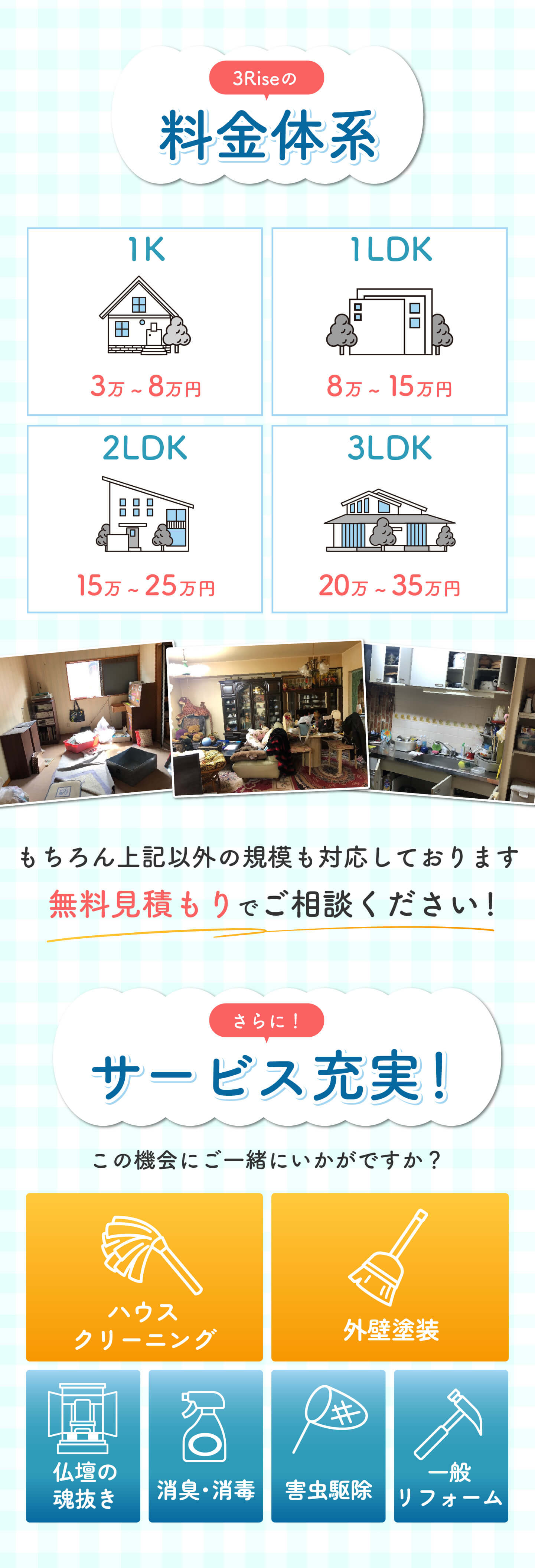 | 事業内容 | ハウスクリーニング、解体業、遺品整理 ※遺品整理(残置物撤去)はReliefのFC加盟店とし業務を実施いたします |